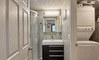 The bathroom has a stand up shower, hair dryer, iron & board and a washer & dryer so that you can take care of your laundry needs.