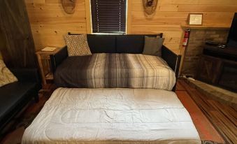 The cabin has a queen size bed upstairs in the loft and a pull out futon suitable for one adult or two children downstairs, as well as a separate trundle bed with two twin size beds available. Please review photos of the living room, trundle and futon while its in the down sleeping position so you are familiar with all the sleeping arrangements. Also, please review the photos of the spiral staircase. Guests with limited mobility may find it harder to access the upstairs loft.
