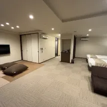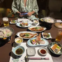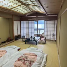 Номер оформлен в классическом японском стиле, большой и просторный, с балконом, откуда открывается чудесный вид на закат. Настоятельно рекомендую пакет «одна ночь + два питания»: завтрак и ужин предлагают разнообразное меню и приятную атмосферу. Зона купания хранит богатую историю, особенно заметны следы серы у выхода из источника. Транспорт также удобно расположен всего в двух минутах ходьбы от станции.