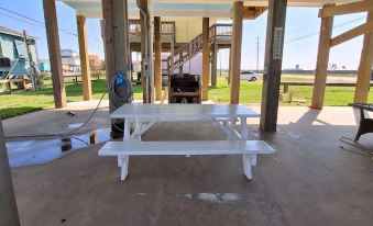 Underneath the house, you'll find a picnic table that's perfect for outdoor meals or casual gatherings. This area offers a cool, shaded space to enjoy meals while still being close to the beach. For those who love to barbecue, the charcoal grill is a highlight. It's conveniently located and easy to use, allowing you to grill up your favorite foods while enjoying the company of friends and family.