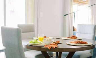 The bright and airy kitchen is fully equipped with all the appliances, utensils, and cookware you need to feel at home. This thoughtfully designed home provides a scullery area in addition to a separate laundry area. The dining area seats 5 with 3 additional seating at the island bar.