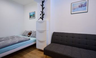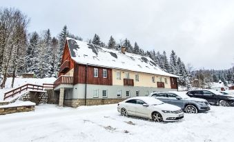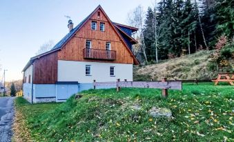 5 km from Bedřichov: Beautiful cottage, 3 storeys, detached, built in 2020. 10 apartments in the property. In the resort Hraničná, 1 km from the centre of Janov nad Nisou, in a quiet position, 800 m from the skiing area. For shared use: property with lawn. Garden furniture. Storeroom available. Parking (for 2 cars) at the house. Grocery 1 km, restaurant 3 km, pub garden 1.5 km, bus stop "Janov nad Nisou, samoobsluha" 900 m, railway station "Lučany nad Nisou" 8 km, outdoor swimming pool 3 km. Indoor tennis centre 1.5 km, walking paths from the house, cycle lane 300 m, ski lift 800 m, chair lift 2 km, slopes 800 m, ski rental 2 km, ski school 2 km, cross country ski track 300 m, children's playground 1 km. Nearby attractions: Pumptrack Janov nad Nisou 1 km, Královka 3.5 km, Bobová dráha 1,7 km, Slovanka, Albert 3.5 km, Bedřichovská vodní nádrž, Bramberk, Josefův Důl vodní nádrž 6 km, Liberec: Zoo, Aquapark, iQLANDIA 12 km, Szklarska Poręba 42 km. Well-known ski regions can easily be reached: Bedřichov 2 km, Severák Hrabětice 6 km, U vodárny 1.5 km. Hiking paths: Jizerská magistrála 300 m, Lanový park Arthur 6 km. "Hašlerka", 2-room apartment 55 m2, on the ground floor. Bright, very beautiful and modern furnishings: living/dining room with 1 sofabed, 1 double bed and Scandinavian wood stove (only for decoration), dining table, TV and electric heater. 1 room with 1 sofabed, 1 french bed and electric heater. Kitchenette (oven, 4 ceramic glass hob hotplates, freezer). Shower/WC. Electric heating, underfloor heating. Box-room. View of the valley. Facilities: Internet (WiFi, free). Parking (2 cars) at the house. Please note: suitable for families. Non-smokers only.