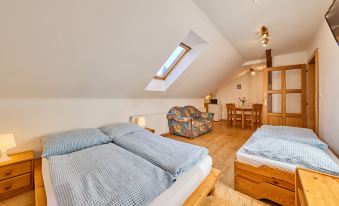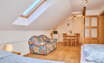 Cosy, rustic residence "Villa Belvedere", detached. 10 apartments in the residence. In the resort, 200 m from the centre, in a sunny position, 500 m from the skiing area. In the house: central heating system. Linen change (suppl. charge extra). Towel change (suppl. charge extra). Room cleaning on request (extra). Parking at the house, public parking extra. Grocery 300 m, restaurant 50 m, bus stop "Janské Lázně - Lesní dům" 300 m, railway station "Svoboda nad Úpou" 3.3 km, park "Farmapark Muchomůrka" 1 km, outdoor swimming pool 7 km, indoor swimming pool 400 m. Tennis 1 km, minigolf 400 m, cycle lane 100 m, cable car 600 m, ski lift 300 m, chair lift 500 m, gondola lift 600 m, slopes 300 m, ski rental 300 m, ski school 400 m, children's ski school 300 m, sled run 700 m, cross country ski track. Nearby attractions: Lanovka na Černou horu 600 m, Janské Lázně Spa, Stezka korunami stromů 1 km, bobová dráha 5 km, Pec pod Sněžkou, Relaxpark, bobová dráha 11 km, Vrchlabí 10 km, Trutnov 12 km, Malá Úpa 15 km, Zoo Dvůr Králové, Adršpach 35, Karpacz 40 km. Well-known ski regions can easily be reached: SkiResort ČERNÁ HORA - PEC, Mladé Buky 5 km, Horní Malá Úpa 16 km, Špindlerův Mlýn 30 km. Hiking paths: krkonošské naučné stezky. Please note: no lift. 1-room studio on 2nd floor. Bright, beautiful and cosy furnishings: 1 room with 1 bed, 1 double bed and TV. Kitchenette (2 hot plates, microwave, electric coffee machine). Shower/WC. Facilities: Internet (WiFi, free). Please note: suitable for families. TV only CS.