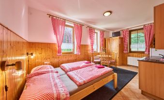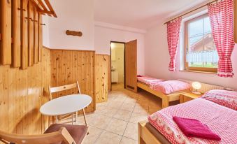 Cosy, comfortable cottage "U Švýcarského dvora", detached, built in 2006. 4 apartments in the property. In the resort 800 m from the centre of Janské Lázně, in a quiet position, 200 m from the skiing area. For shared use: well-kept garden with lawn. Patio, pergola, garden furniture, barbecue, children's playground (swing). In the house: WiFi, central heating system. Parking (for 4 cars) at the house. Grocery 1.2 km, supermarket 2 km, restaurant 1 km, café 1 km, bus stop "Janské Lázně, Lesní dům" 700 m, railway station "Svoboda nad Úpou" 2.8 km, outdoor swimming pool 1 km, indoor swimming pool 1 km, thermal baths "Janské Lázně" 1 km. Golf course (18 hole) 8 km, tennis 800 m, minigolf 2.5 km, riding stable 2 km, walking paths from the house 20 m, cycle lane 700 m, ski lift 900 m, gondola lift 1.7 km, slopes 200 m, ski rental 600 m, ski bus stop 50 m, ski school, sled run 800 m, cross country ski track 2.5 km, children's playground 200 m. Nearby attractions: Aquacentrum, Janské Lázně Spa 1 km, Stezka korunami stromů Janské Lázně 3 km, RelaxPark Pec, lanovka Sněžka 15 km, zámek Vrchlabí, Aquacentrum Vrchlabí 18 km, Špindlerův Mlýn, Zoo Safari Dvůr Králové 33 km, Adršpašské skály 42 km. Well-known ski regions can easily be reached: Janské Lázně - Košťálka 1.5 km, Černá hora - Pec 1900 m, Mladé Buky 7 km, Horní Malá Úpa 20 km, Špindlerův Mlýn 34 km. Well-known lakes can easily be reached: Dolce Trutnov 18 km. Hiking paths: krkonošské naučné stezky. Please note: suitable for families. Owner lives in separate semi-detached house. "U Švýcarského dvora IV", 2-room apartment 37 m2, on the ground floor. Practical and cosy furnishings: 1 room with 2 beds. 1 room with 1 double bed and satellite TV. Kitchenette (2 hot plates, kettle, microwave). 2 showers/WC. Heating. View of the garden. Facilities: Internet (WiFi, free). Please note: non-smokers only. Smoke alarm, fire extinguisher.