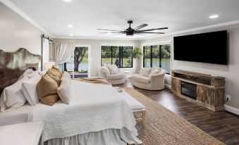 Everything is brand new & totally remodeled. All 1 level living w luxurious tile baths, designer kitchen w granite countertops, full size laundry room, voluminous open interior, kids retreat room, oversized tvs in all rooms, private decks off all bedrooms, retractable remote shades in the primary bedroom to enjoy the sunset in bed, stone paver fire pit, private dock & easy lake access..this home has it all.About pets:Pets allowed: dogs (limit 2 total).About checkOut:Check out before 10:00 AM.About children:Children allowed: ages 0-17.About checkIn:Check in after 3:00 PM.About smoking:Smoking is not permitted.About minBookingAge:Minimum age to rent: 21.About events:No events allowed.
