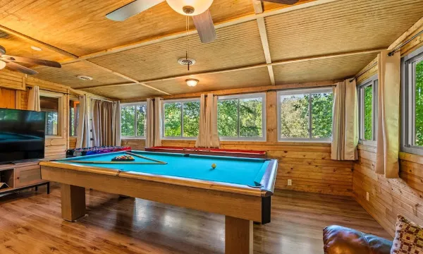 Please read full description prior to instant booking. Smoky Mountain Lakeside Lodge! Spacious 4200 sq. ft. pet friendly cabin close to Smoky Mnts and tourist areas of Sevierville, Pigeon Forge, and Gatlinburg. Lakeside with a dock at bottom of hill behind Cabin. Full game room with shuffleboard, foosball, pool table, dart board, golf game, board games, karaoke, and large flat screen TV. Firepit, sauna, hot tub, and outdoor yard games included. Work desk and WiFi available. Extras for not additional cost include 2 paddle boards and 6 kayaks. Rental lease required. $500 refundable deposit, $300 refundable pet deposit, $60 nonrefundable pet deposit. This deposit is not included in price paid and is requested on day of check in. Deposit is returned day of check out.