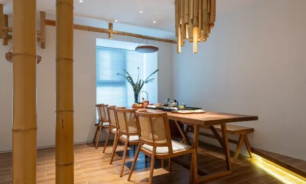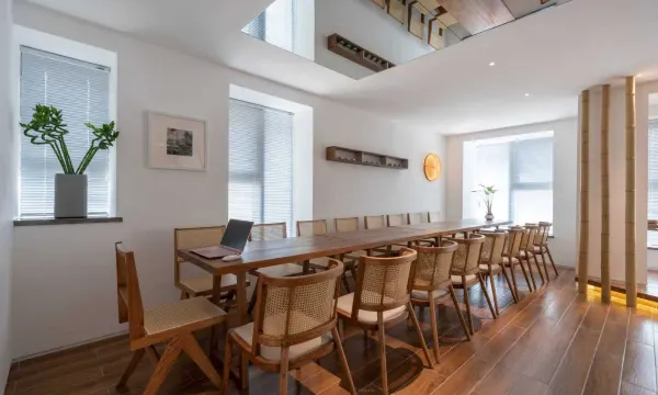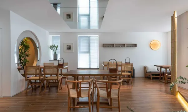 Shangquan Lishe · Chayue Designer Hotel incorporates the elegance of tea into the texture of its space. The lobby draws inspiration from tea; the corridor features background walls made by piecing together old tea cakes, with the fragrance of tea drifting in with the breeze. Guest rooms are decorated with bamboo elements, and all furniture is custom-made. The suspended tea tables and translucent gauze curtains echo the charm of "emptiness". These elements complement each other, creating a tranquil and refined atmosphere.Staying here at night, one can enjoy the dim light of tea candles. From the display of tea utensils, every detail embodies the essence of tea, allowing travelers to encounter the warmth and poetry of Oriental life amid light, shadow and the fragrance of tea. Here, the building blurs the boundary with the sky, and every window is a painting that frames the flowing light and shadow, making the stay a private conversation with the clouds.
