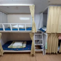 Let’s start with good things. There is little kitchen you can use. There is free tea. There are two showers and one toilet room near the former entrance. Washing machine is free. The place is opened 24 hours. Wifi is fine. The mat and pillow are comfy. English-friendly.