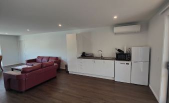Each unit has a central living space with dining, lounge, and a kitchen or kitchenette. The front unit boasts a fully equipped kitchen with an oven, electric hob, dishwasher, and a granite-top island, perfect for socializing. The rear unit features a convenient kitchenette with a fridge/freezer, dishwasher, and microwave. Both units include leather lounge suites, dining tables for 6, large smart TVs (65" and 55"), and fibre WIFI with Netflix and Disney+.