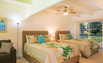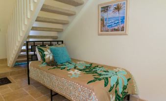 This welcoming 2-bedroom, 2-bath condo in Princeville on the North Shore comfortably accommodates four guests, plus an extra twin bed tucked under the open staircase — ideal for a special guest stopping by for a night or two.