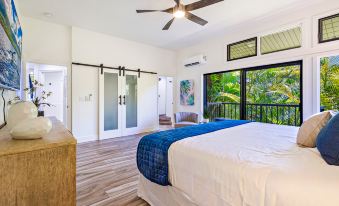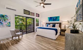 Step into soaring-ceiling elegance where natural light, breeze, and panoramic views are part of the welcome. The open-plan living area features a queen sleeper sofa, smart TV, and A/C to keep things comfy, while wide sliders draw the eye (and footsteps) straight to the view-deck lanai.
