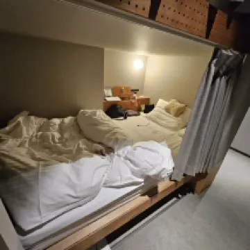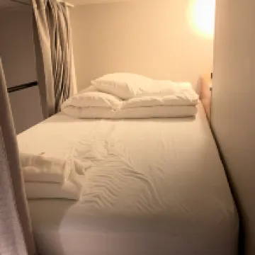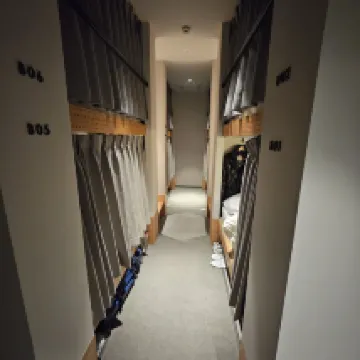 Я прожила в общей комнате на восемь человек два дня: трое в первый день и двое во второй. Все были очень вежливы и спокойны. Отель расположен на третьем этаже прекрасного здания. Ароматерапия в общих зонах была успокаивающей, а администратор был улыбчивым и терпеливым. При входе в номер вы проходите через ванную комнату с большой раздвижной дверью. Общая ванная комната хорошо спланирована и очень просторна, с отдельными зонами для мытья посуды и душа, и все удобства высокого качества. Хотя в номере восемь двухъярусных кроватей, совсем не было тесно. Кровати шириной 1,2 метра, есть встроенные шкафчики, прикроватные лампы и USB-порты – все необходимое. Матрас и подушки были очень удобными; короче говоря, внимание к деталям было превосходным.