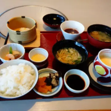 Ресторан на первом этаже также открыт для всех желающих. На второй день я заказал комплексный обед за 1800 иен, который был очень вкусным и красиво оформленным. Всего в 50 метрах от отеля находится знаменитый ресторан Kawashima Tofu, но, к сожалению, был выходной, и я не смог его попробовать; с другой стороны — ресторан Yamashige Live Shrimp Cuisine, который мне очень понравился!