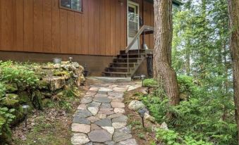 Take the back deck stairs or a gentle walk down the south stone path to our huge year-round dock ideal for sunbathing, fishing, swimming and diving. The north path leads to a low water entry point and swimming area.