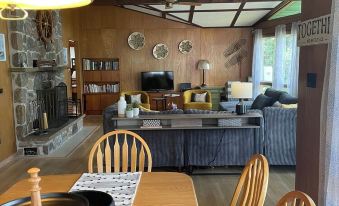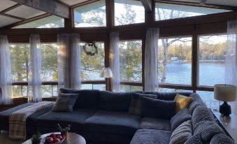 Enjoy over 1,500 sq. ft. of living space, with 4 bedrooms, well equipped kitchen and dining table that expands to seat 10 guests. The Great Room features a stone wood burning fireplace and floor-to-ceiling windows with panoramic lakefront views.