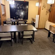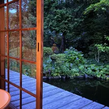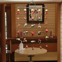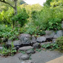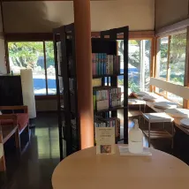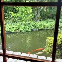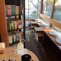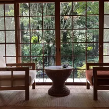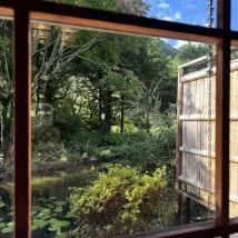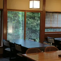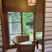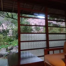 В лобби есть семена сезонных растений из сада, а также продаются небольшие изделия ручной работы. Есть небольшой книжный шкаф. Панорамные окна выходят на небольшой ручей, обрамлённый клёнами — должно быть, осенью здесь очень красиво. Здесь очень уютно, как в старом доме из старой японской драмы.