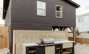 • Backyard Oasis featuring an outdoor eating area, outdoor kitchen with gas grill, cozy backyard oasis for seven and hammock swing.