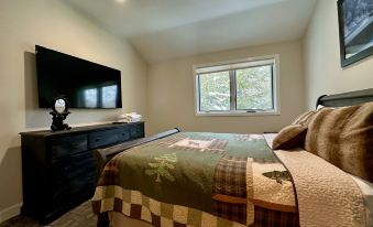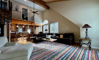 The spacious living area features cozy seating, a flat-screen cable TV, and high-speed Wi-Fi, creating the ideal space to relax after a day on the slopes. The fully equipped kitchen includes modern appliances, cookware, and dining essentials, making it easy to prepare meals for your group.