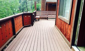 This cabin is a two-story, 4 BR/2 BA in a quiet neighbourhood on the North Shore. NEW Remodeled KITCHEN and dining area!! Lovely themed cabin kitchen. Wrap around bench seating in the dining room. The kitchen, living and dining area has an open floor plan with vaulted ceilings and a gas fireplace. A spacious deck with wrap around seating is ideal for family and friend gatherings. Or relax in the private 5 people hot tub beneath the deck.