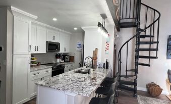 The first floor includes 2 bedrooms, a newly remodeled bathroom that includes a double vanity and shower/tub and a convenient laundry area with a brand new washer and dryer. The master bedroom features a king size bed, new 53” TV and boasting its own private and fully furnished balcony. The second bedroom is located on the first floor and is furnished with a queen size bed and features a 53" TV.