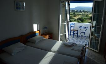We booked this place by phone, communication was very easy with owner Mihalis. Room has shower with hot water, air conditioning, small fridge with freezer, cooking facilities, cutlery. The best thing is that is sooo peaceful, you wake up in the morning with tens of birds singing, no noise, no cars, nothing. All rooms look to the west, this means they dont get very warm from early. Rooms in the last building ( 105, 106) overlook a beautiful garden full of olive trees, fruit trees and more...A paradise!! Another plus is that it is located about 1 km from Livadi's center, where you have few restaurants, gaz station, pharmacy, two supermarkets , rent-a-car agency. Easy access to Kalamos and to all southern beaches. We def recommend