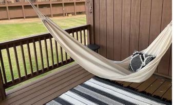 On the second floor are two bedrooms. The first has a queen bed, twin bunk beds and full bathroom with tub. The second bedroom has a king bed, full bathroom with tub and private balcony with hammock. Both rooms have dressers and large closets, as well as TVs.
