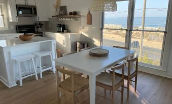 On the third floor is the living area and television, dining with seating for 6 and large kitchen with new appliances and a kitchen. island with two bar stools. The third floor deck overlooks the ocean with outdoor lounge seating and dining.