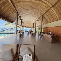 Как только лодка причаливает к пирсу, сразу видна вывеска отеля. После того как вы найдете персонал и подтвердите свое имя, они помогут забрать багаж с лодки. Затем небольшой тук-тук доставит вас до отеля. В холле вас ждет регистрация заезда, а также приветственные холодные полотенца, напитки и мороженое. Персонал подробно расскажет об отельном приложении (через него заказывается завтрак, и через него же можно запросить любую услугу). Каждый вечер большой трансфер отвозит гостей на пешеходную улицу (см. расписание на фото 9).