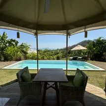 Великолепное место, спокойствие, очарование, романтика, природа, отдых, все есть, чтобы зарядиться энергией. Мы пробыли там 3 ночи, хотелось бы остаться еще на несколько дней. Ресторан предлагает нам типичные и превосходные блюда, а вид на море и пейзажный бассейн придает трапезе дополнительное очарование. Не стесняйтесь воспользоваться спа (массажем). Природа присутствует постоянно, птицы, ящерицы…. Виллы типичные, с красивой террасой с видом на море, ванная комната (внешняя) отличается от наших ванных комнат, облицованных плиткой. Здесь есть все и создано для волшебного, расслабляющего отдыха. Мы были парой, это было похоже на медовый месяц.