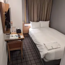 Очень удачно расположен вблизи станции санномия и автобусных станций. Заселение быстрое с помощью автомата, также есть сотрудник на ресепшн, если что поможет. В лобби можно взять гигиенические принадлежности, чай и кофе. Номер был маленький, место только для одного открытого чемодана, все необходимое было. Очень удобная кровать и подушки. Стол маленький, на одного. Можно открыть окно. В ванной гель для душа, мыло, шампунь и кондиционер. Есть чайник и холодильник, кружка. Завтрак в японском стиле, очень вкусные круассаны, выбор достаточный. Можно оставить багаж до и после проживания.