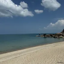 Отель находится прям рядом с местной достопримечательностью (камни бабушка и дедушка), в конце пляжа. Я отдыхала в начале июня и вода была прекрасна: прозрачная, оооочень комфортная по температуре, чистая. В отличие от пляжа Чавенг, заход в воду был более комфортным, так как не нужно было очень далеко идти по мелководью, но и не было очень глубоко сразу у берега. Далековато находится основная улица с едой, но в принципе по близости вы найдёте и массажи, и еду и супермаркеты.
