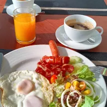 Завтрак подается не по системе «шведский стол», а по трёхкратному меню на выбор. Хотя нам показалось, что это немного скудно, сама еда была очень вкусной.