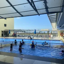 Есть бассейн. На самом деле два: один для детей и один для взрослых. Но дети идут куда хотят, к сожалению. Есть тренажерный зал. Есть детская комната. Есть бар/закусочная. Есть игровой стол. Есть шезлонги и два зонтика. Он находится через дорогу от торгового центра Imago. Рестораны находятся примерно в 10 минутах ходьбы.