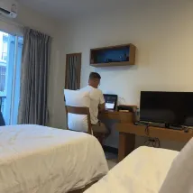 Все хорошо, чисто, уютно, кондиционер на минимуме охлаждал умеренно, есть балкон с видом на город, было тихо , с улицы шум особо не слышно. На одну, две ночи вполне можно заселиться.