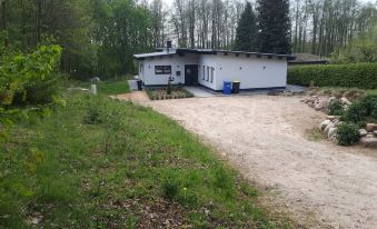 In the living area with an oven. From the living room you come directly into the bedroom with an attached large bathroom with sauna. Via the entrance hall you come to the second area of the house, which is divided into a bedroom, bathroom and small kitchen with sofa bed. You can relax ideally on the large outdoor terrace with a view of the forest and meadows without a view of the neighbors. There are loungers, chairs, a table and a kettle grill. The perennials newly planted on the terrace bloom from spring to autumn. Many bees and bumblebees frolic there and on the flower meadow.