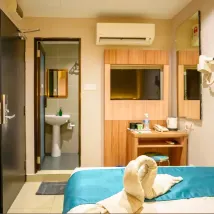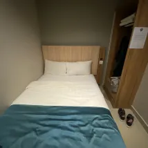 Номер очень маленький, подходит только для путешествующих в одиночку с небольшим багажом. Хорошая горячая вода в душе. Подходит для ночёвки.