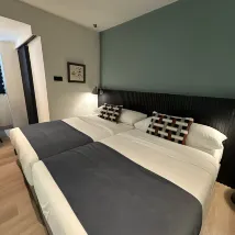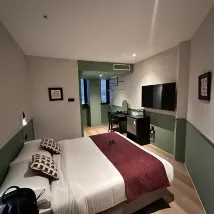 The room design and color palette (white, green, dark wood furniture, and black and white tiles) were absolutely beautiful. I loved the décor! There’s a smart TV, a mini fridge, and the bathroom area is nicely arranged. The shower area itself is a bit narrow, but the sink area is fine, and there’s a shower curtain to keep the water from splashing out.