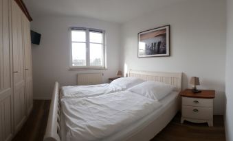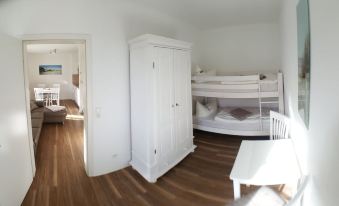 The apartment has 3 rooms: 1 bedroom with double bed, 1 bedroom / children's room with a loft bed and a living room furniture in real wood with enough storage space and a dining table with 4 chairs. All rooms are bright and friendly. In the entrance area there is a new kitchen with a fridge, microwave and a ceramic hob with 2 hotplates, dishes, cutlery and glasses for 4 people and plenty of space for. B. for food. Coffee machine, kettle and toaster complete the equipment.
