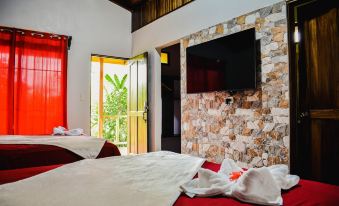 Private, Bungalow type setting. The room was well equipped, with internet, air conditioning, plenty of excellent coffee on hand. Morning times were what my wife and I really enjoyed. A fantastic breakfast complete with plenty of excellent chilled, fresh fruit, and excellent company with the owner and his family. Monkey’s, Turkeys, Toucans, and a friendly little Hummingbird that would appear every morning, buzzing around close by as she enjoyed breakfast with us! Needless to say, we plan on returning next March. Fantastic experience.