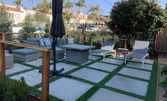 The retreat has exclusive use of the newly installed front yard/patio with dining table, lounge chairs, couch, and BBQ. This is not a shared space. There is also a enclosed area to store beach toys and bikes. The downstairs residence has exclusive use of the back patio.