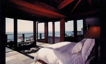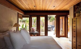 The upstairs master bedroom is separated from the main level of the home and is accessible though the home's intimate courtyard and up a small flight of stairs. This room, to put it simply, is stunning. Views of the Pacific are unobstructed, the en-suite bathroom is a masterpiece of design and craftsmanship.