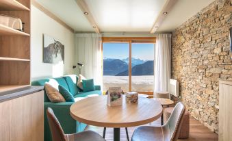 Residence "La Duit". In the complex: reception, WiFi (all included). Parking. Shop 50 m, 5 minute walk to the centre, bus stop 5.8 km, railway station "Moutiers Salins" 20 km, thermal baths "Spa Thermal de La Lechere" 12 km. Chair lift, skisport facilities 50 m. Nearby attractions: Vallée de Valmorel, Acrobatique Magic Aventure, Domaine VTT. Well-known ski regions can easily be reached: Vallée Doucy Valmorel. Please note: entertainment in the season. 2-room apartment 27 m2. Practical furnishings: living/sleeping room with 1 double sofabed and TV (flat screen). 1 room with 1 french bed. Kitchenette (oven, dishwasher, 2 ceramic glass hob hotplates, toaster, kettle, microwave, freezer, electric coffee machine, Capsules for coffee machine (Nespresso) extra). Shower, sep. WC. Heating. Terrace. Deck chairs. View of the valley. Facilities: hair dryer. Internet (WiFi, free). Parking. Please note: maximum 1 pet/ dog allowed. Smoke alarm.