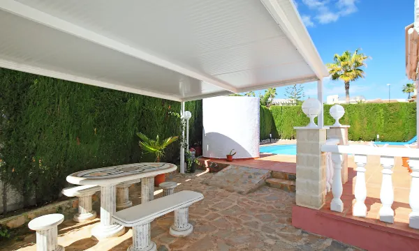 Bello Horizonte I 7 km from Playa Albir: House "Leon", 2 storeys, detached. On the outskirts, 5 km from the centre of La Nucia, outside the resort, 3 km from the centre of Alfaz Del Pi, in a quiet, sunny position residential area (villas), 7 km from the sea, 7 km from the beach. Private: property (fenced), large garden, swimming pool (8 x 4 m, depth 120 - 200 cm, seasonal availability: 01.Jan. - 31.Dec.) with internal staircase. Outdoor shower, arbour, garden furniture, barbecue, roofed, parking on the premises. Supermarket 800 m, restaurant 200 m, tram "Benidorm" 10 km, bus stop "Av. La Carretera, 9 (Nucia)" 5 km, railway station "Alicante" 54 km, underground station "Benidorm" 10 km, ferry "Dénia" 47 km, sandy beach "Benidorm" 14 km, shingle beach "El Albir" 7 km. Golf course (18 hole) 14 km. Nearby attractions: Alfaz del Pi 3 km, Altea 5 km, Alicante 45 km, Valencia 140 km, Aqualandia Benidorm 14 km, Terra mitica Benidorm 14 km. Please note: car recommended, no lift. Baby equipment on request. The owner does not accept any youth groups. The entire house is at your disposal with a big, improved kitchen. "Leon", 5-room house 110 m2 on 2 levels. Object suitable for 8 adults + 2 children. Bright, comfortable furnishings: living/dining room with 1 sofabed, digital TV, gas heating and air conditioning. Exit to the patio, to the swimming pool. 1 room with 2 beds (90 cm, length 190 cm), air conditioning and forced-air heating. Exit to the patio. 1 room with 1 x 2 bunk beds (90 cm, length 190 cm), air conditioning and forced-air heating. Large, open kitchen (oven, dishwasher, 4 ceramic glass hob hotplates, toaster, kettle, microwave, freezer, electric coffee machine). Sep. WC, bath/shower/WC. Gas heating. Upper floor: living/dining room 17 m2 with 1 sofabed, digital TV, air conditioning, fan and forced-air heating. Exit to the terrace. 1 room 10 m2 with 2 beds (90 cm, length 190 cm), air conditioning, fan and forced-air heating. Small kitchen (3 hot plates, oven, dishwasher, 3 ceramic glass hob hotplates, toaster, kettle, microwave, freezer, electric coffee machine). Shower/WC. Forced-air heating. Terrace 6 m2, large garden. Terrace furniture, barbecue, deck chairs. View of the swimming pool and the garden. Facilities: washing machine, iron, hair dryer. Internet (WiFi, free). Parking. EGVT-593-A. VT-488155-A