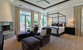 Primary Suite: Four-poster California King, fireplace, seating area, two cedar walk-in closets, spa bath with soaking tub & walk-in shower.