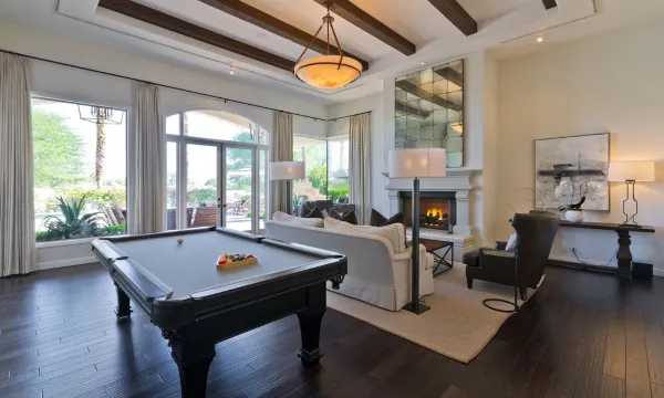 Located on the 17th signature hole of the Greg Norman Course at PGA West, the estate offers breathtaking lake, mountain, and golf course views. Floor-to-ceiling windows, travertine floors, and wood-beamed ceilings create a bright, airy, and sophisticated atmosphere throughout the 4,700 sq. ft. professionally designed interior, furnished with Restoration Hardware.