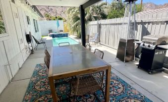 In the heart of this desert haven, you'll discover a modern kitchen equipped with top-notch appliances and chic quartz countertops. The living room is where the fun begins, thanks to a record player and an impressive vinyl record collection that lets you groove to your favorite tunes.