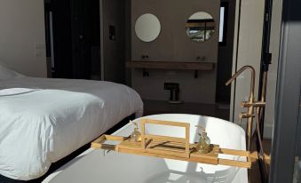 - A master suite of approximately 38 m² with a king-size bed (180x200), including a toilet, an open bathroom with a double shower and bathtub, and a dressing room.