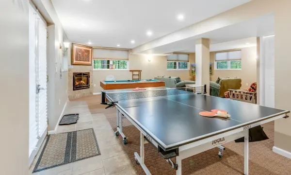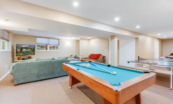 The full kitchen features a breakfast bar and is fully equipped with dishes, pots, cutlery, glasses, coffee maker, crock pot, air fryer, pressure cooker, toaster, hand mixer, blender, chopper, baking pans, bowls, containers and more. The dining room seats 9-10. Finished basement has gas fireplace, 55' LCD TV, Music docking station, brand new washer/dryer, leather couch, games (pool tables, air hockey and a ping pong table). Basement has a full bathroom with stand up shower and sink. There is also a laundry room with washer and dryer. Please bring YOUR OWN detergents. Home is 5 minutes from skiing and 10 minutes from lake.