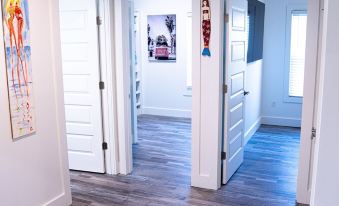 The Great Room has 3 daybeds with twin size memory foam beds to lounge or sleep on as your group needs. There is a 70” Samsung Smart TV for y’all to enjoy great shows as a group or sit down at the coffee table and enjoy a card game.