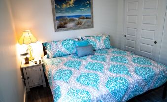 The 2nd Bedroom has a King size bed with a night stand and a power strip for phone chargers. There is a 70” Samsung Smart TV. The 2nd Bedroom has a closet with extra pillow and blankets. Close by is Bathroom #2 with a Tub/Shower comb, vanity with mirror, and toilet.